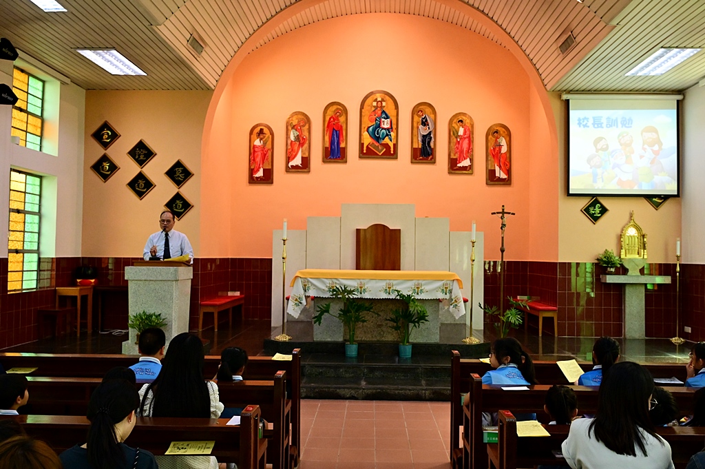 本年度的校本主題是「善良」,當天的讀經選自「慈善的撒瑪黎雅人」故事,馮校長訓勉同學,在日常生活中要以善良的心,關懷身邊有需要的人,甚至是自己的仇敵。假如遇到惱怒的情況,我們也要先放下自己憤怒的情緒,冷靜思考。