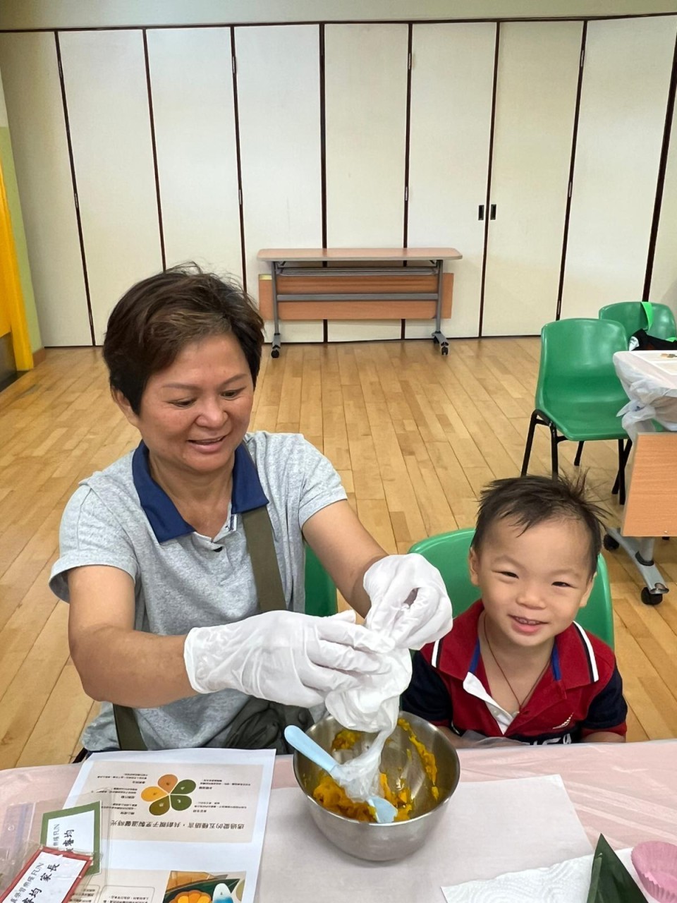 十月十一日幼小銜接活動中,幼稚園生與家長們攜手以健康的南瓜蓉製作成金黃色的茶粿外皮,並包入香甜的紅豆餡料,讓大家感受到傳統食物的製作樂趣,並促進親子間的互動與合作。