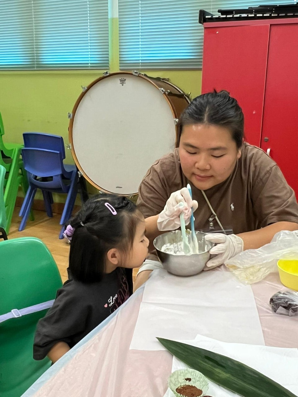 On 11th October, kindergarten students and their parents worked together to make Cha Guo using healthy mashed pumpkin for the outer layer and sweet red bean paste for the filling. This let everyone appreciate the joy of making traditional food while enhancing parent-child interaction and collaboration.